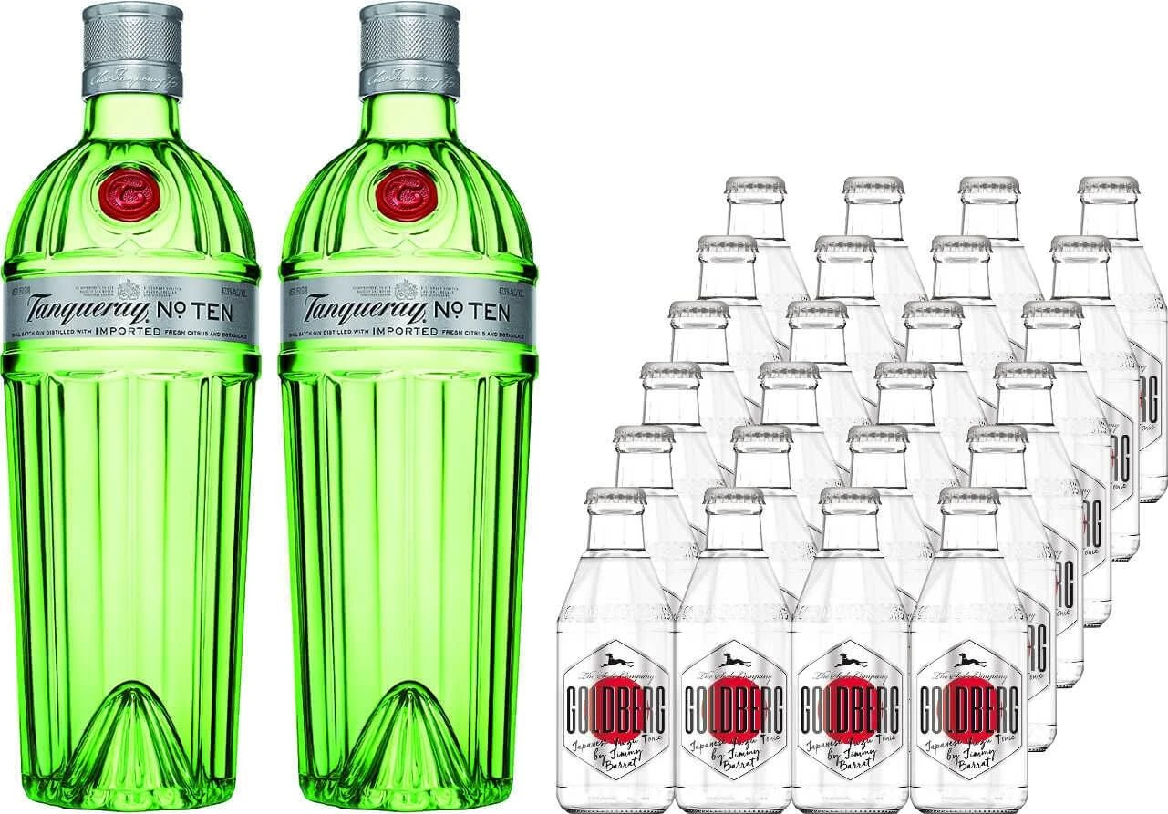 2x Tanqueray 10 in 0,7 Liter Flaschen mit 47,3% Alc. und 24x Limonade von Goldberg in 0,2 Liter Flaschen mit Farbstoff, zzgl. 2,40 € Pfand