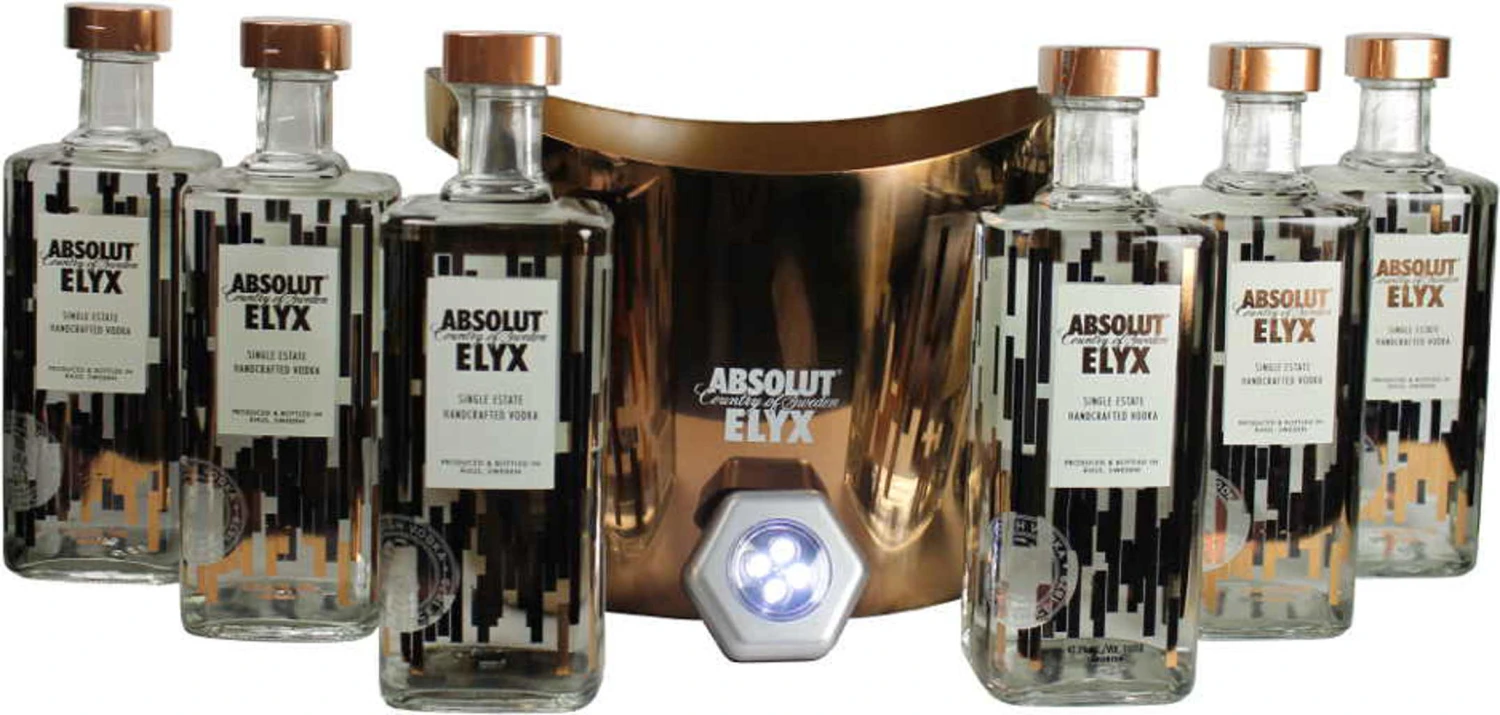Set von Absolut Vodka mit 6x1l Absolut Elyx und Elyx Kühler mit 42,3% Vol. Alc.