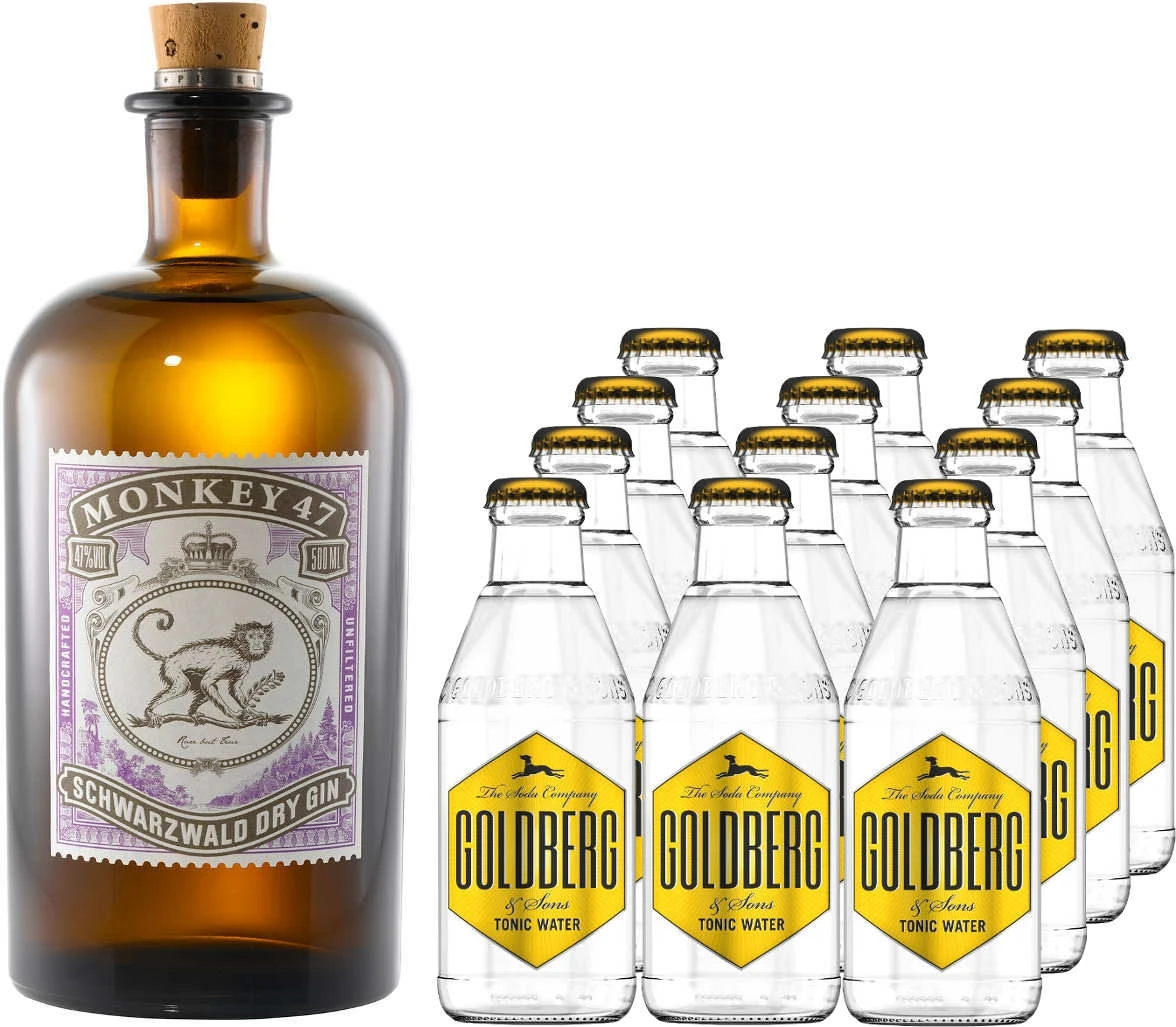 Gin von Monkey 47 in einer 0,5l Flasche mit 47% Alc. und 12x Limonade von Goldberg in 0,2l Flaschen mit Farbstoff, zzgl. 1,20 € Pfand