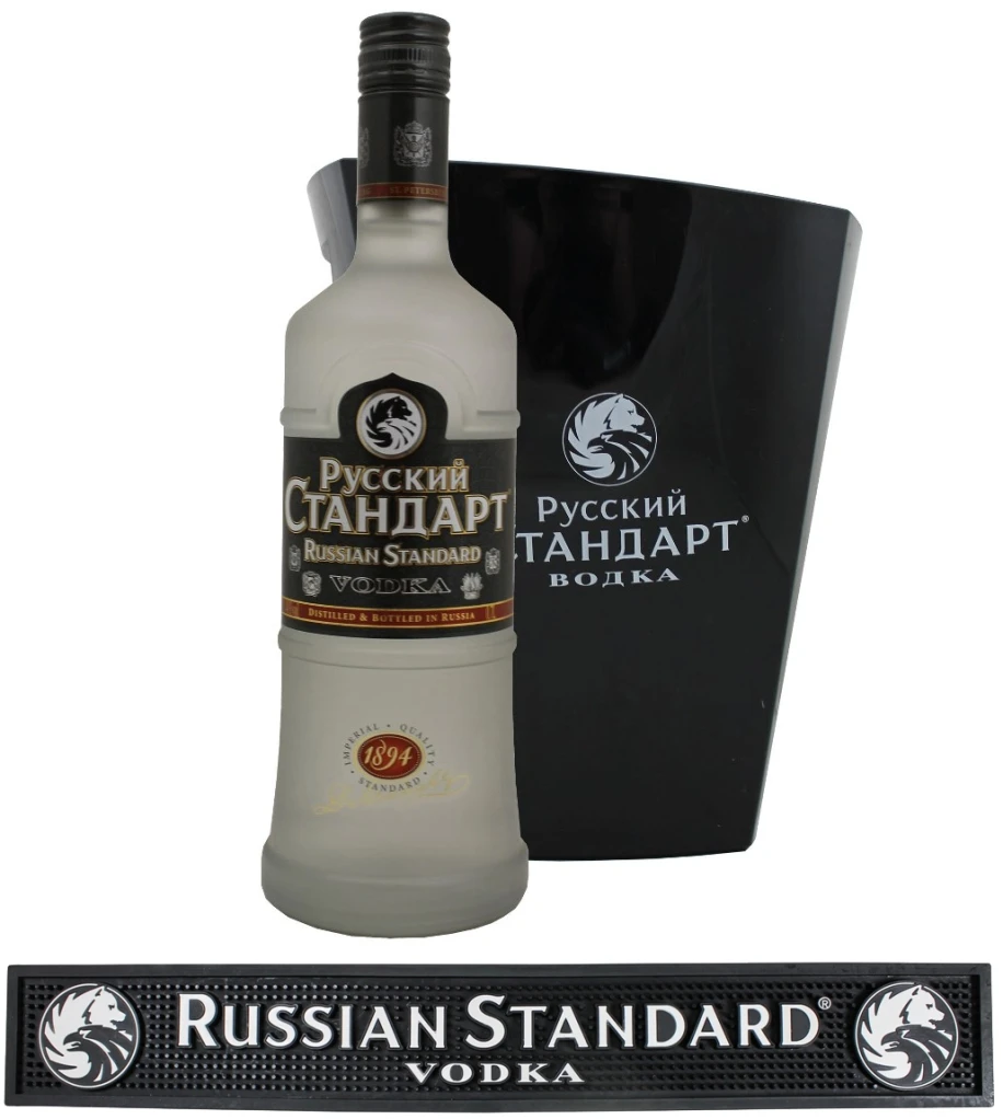 Mit dieser Russian Standard Sonderedition machen Sie Eindruck – bei Profis, Kennern und Genießern! Das Set besteht aus einer Flasche Russian Standard Vodka, einem ebensolchen Kühler und einer dazu passenden Barmatte – damit haben Sie alles zur Hand, was Sie für Ihren Lieblingsdrink benötigen, und aus dem mit Eis beschickten Kühler erhalten Sie Ihren Lieblingsvodka immer mit der richtigen Trinktemperatur!