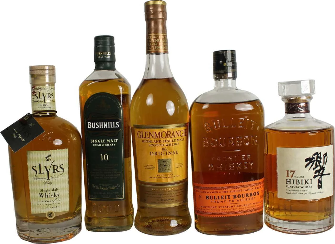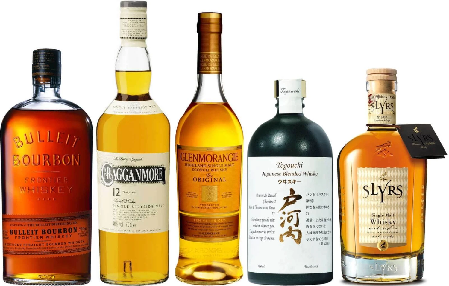 Die Wahl für unser „Whisky Set weltweit“ fiel auf den irischen Cragganmore 12 Jahre sowie den schottischen Glenmorangie Whisky und den amerikanischen Bulleit Kentucky Straight Bourbon. Der japanische Togouchi und der bayerische Slyrs Bavarian Single Malt vervollkommnen das Quintett und stehen stellvertretend für all ihre Länder und die dortige Whisky Tradition.